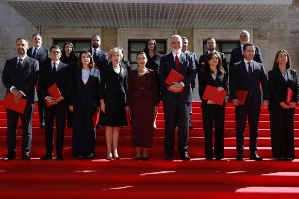 Edi Rama und seine im September 2025 neu gebildete Regierung. Links von ihm: seine Vize-Premierministerin und Infrastrukturministerin Belinda Balluku, die ins Visier von SPAK geraten ist.