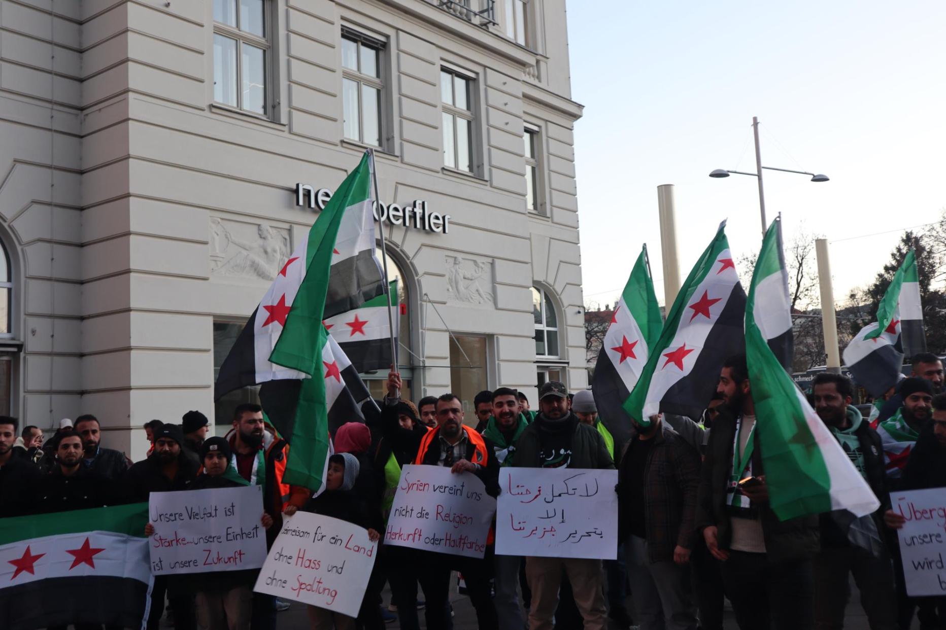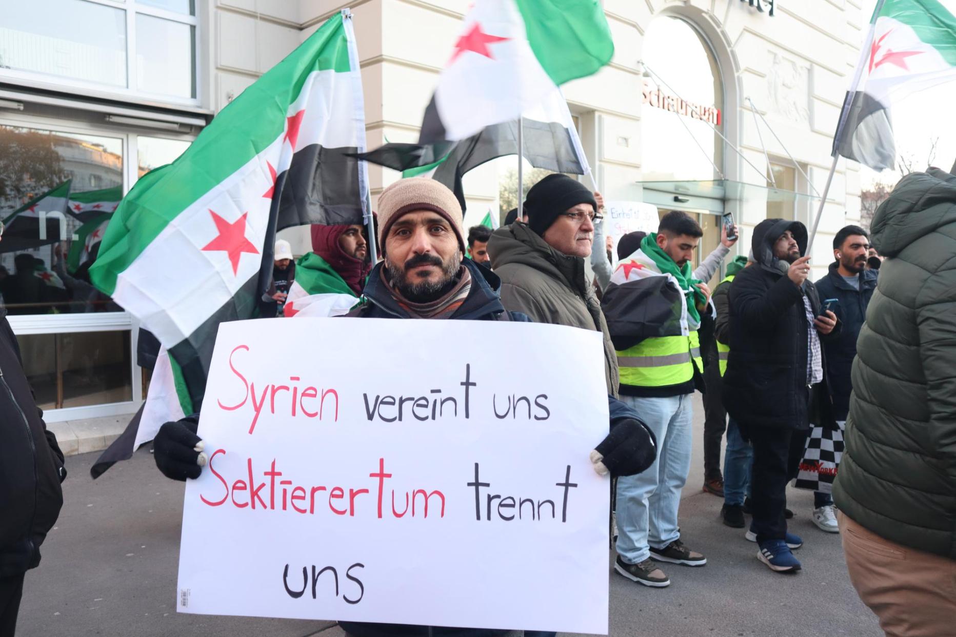 Musik dröhnt aus tragbaren Lautsprechern. „Die Tränen für die Märtyrer der Revolution waren nicht umsonst“, übersetzt der Syrer Ahmat den arabischen Liedtext. Vor der syrischen Botschaft in der Nähe des Schwarzenbergplatzes in Wien feiern Ende November rund 50 Syrer den Sturz der Diktatur Baschar Assads vor einem Jahr. „In Syrien haben sie dieses Lied bei jeder Demonstration gespielt“, sagt Ahmat. 2011 demonstrierte er gemeinsam mit Millionen Syrern gegen das Regime – er war damals 17 Jahre alt.