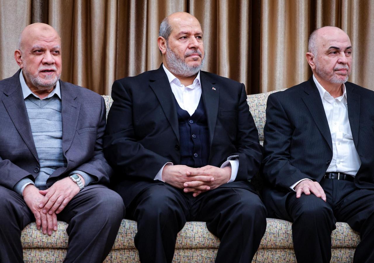 Die Hamas-Führungsriege, wie hier Hauptverhandler Khalil al-Hayya (mitte), werden nicht nach Gaza zurückkehren dürfen.