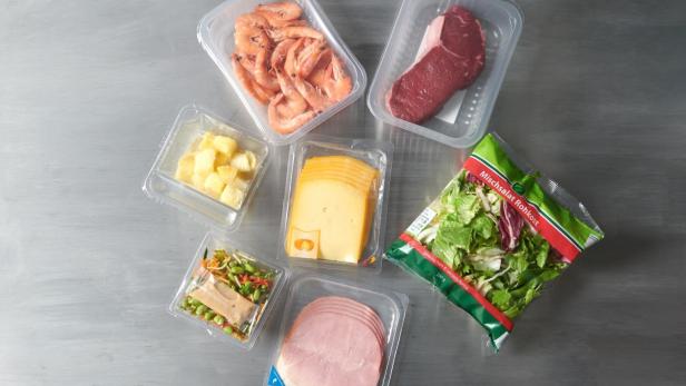 Eine Auswahl an Fleisch, Käse und Gemüse in Plastikbehältern, appetitlich angerichtet.