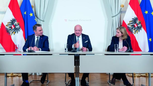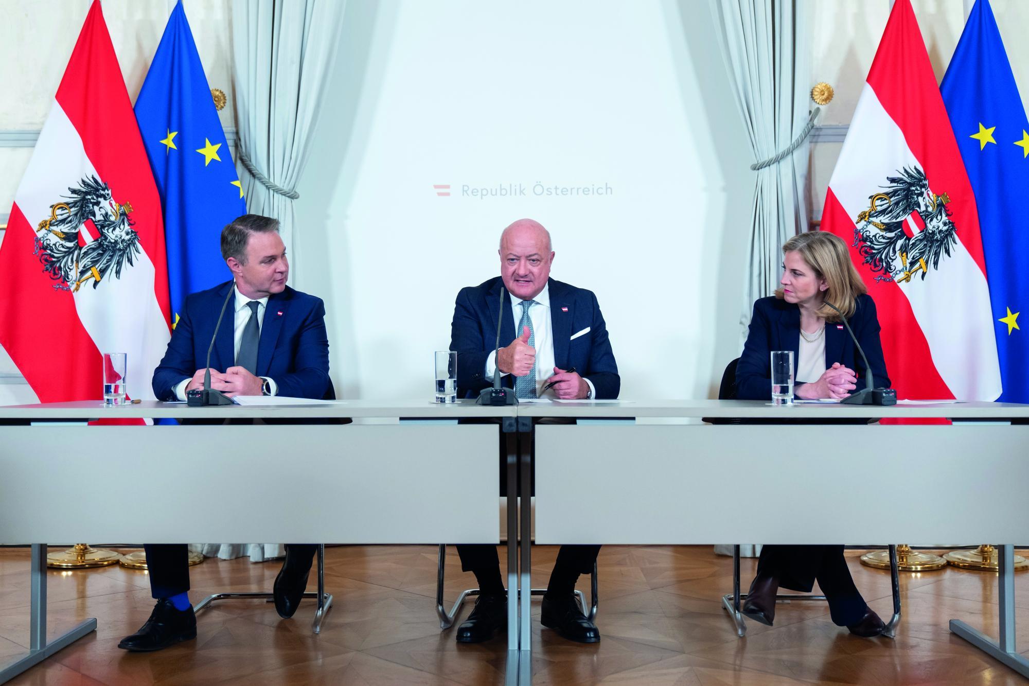 Ob es ein Omen war? Jedenfalls hätte es am 18. März 2025 beinahe gekracht, als die damals noch recht frische Regierungsspitze im Kanzleramt zur Pressekonferenz lud, um das Ergebnis einer Arbeitsklausur zum „Wirtschaftsstandort Österreich“ zu verkünden. Denn Kanzler Christian Stocker öffnete die Flügeltür zum Kongress-Saal derart energisch, dass diese aus den Angeln sprang. Zum Glück nur an der Oberseite. Sie blieb also schief hängen und fiel Beate Meinl-Reisinger und Andreas Babler nicht auf den Kopf. Die Konferenz konnte wie geplant starten (siehe Bild).