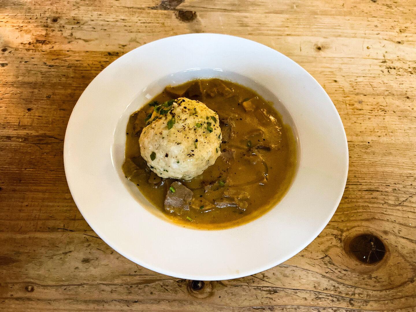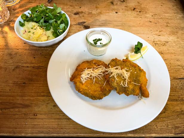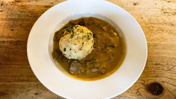 Das Altwiener Backfleisch (Bild oben) wurde vor der Panierung mit viel Senf bestrichen und nach der Frittierung noch mal mit Kren getoppt – herrlich derb. Beilage gibt es nur zum Aufpreis von 4,50 Euro: Der Vogerlsalat ist so gelungen wie schon beim Beef Tatar, der Erdäpfelsalat vielleicht eine Spur zu sehr Püree. Das „Andauer Beuschl“ (Bild ganz oben) ist dann tatsächlich ganz etwas anderes, als man es erwarten würde, und zwar ein Beuschl, das auf Lunge verzichtet. Nur würfelig geschnittenes Herz und Zunge schwimmen in einer dicklichen Einbrennsauce – nein, das ist kein Nepp, die Karte klärt vorher darüber auf. Mitsamt dem Semmelknödel kann man festhalten: Andau, die neue Beuschl-Metropole.