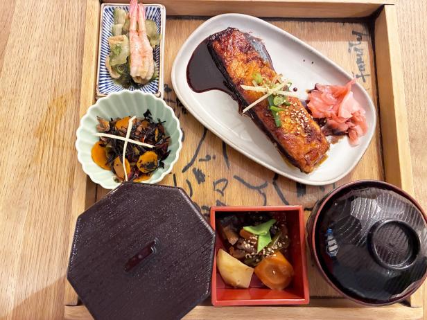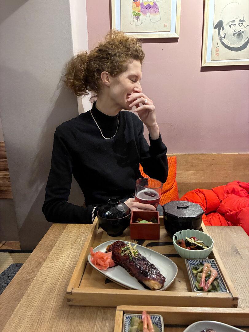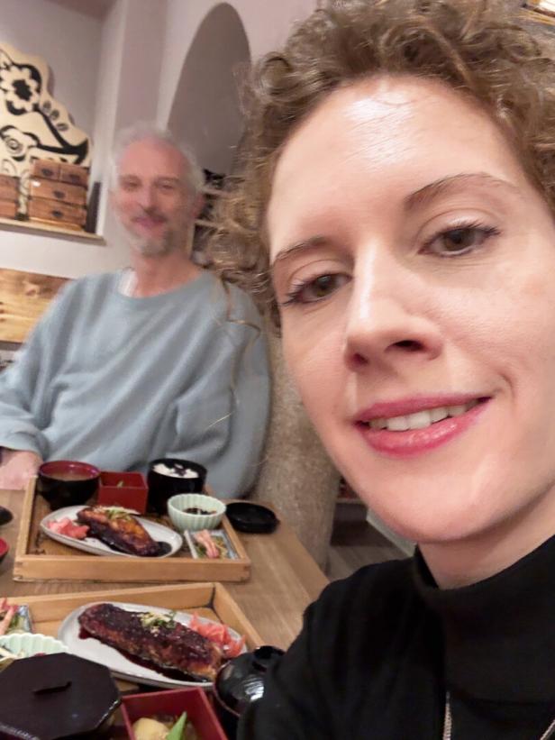 Wir sitzen im „Mari’s Metcha Matcha“, einem Japaner gleich hinter dem Volkstheater. Riedler kommt häufig hierher, immer vor Vorstellungen, und sie isst dann immer das Gleiche: ein Lachs Teryaki Teisyoku (16,90 Euro), also eine Bentōbox – für Leute, die schon mal in Japan waren. Und weil ich das noch nicht war und mit der Karte komplett überfordert bin, schließe ich mich an (eine im Großen und Ganzen gute Idee, auch wenn der Lachs so lange aufgewärmt wurde, dass er nicht nur farblich an einen Ziegelstein erinnert).