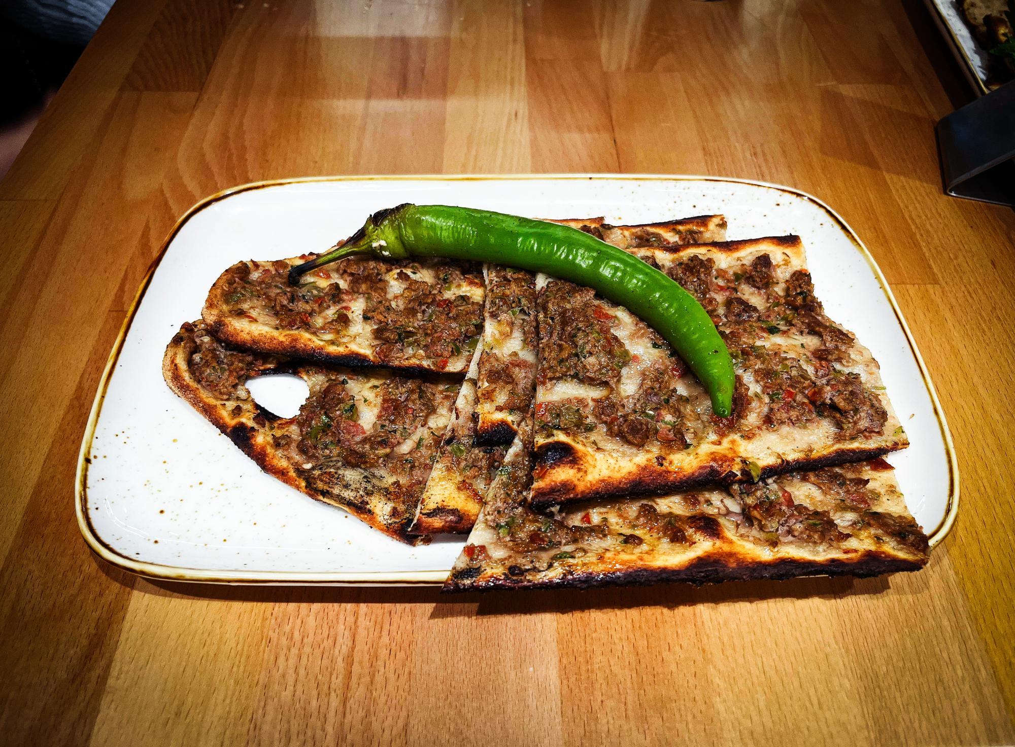 Zum Etli Ekmek (Bild ganz oben): Das Fleischbrot stammt – so erklärt es das Lokal – aus der türkischen Provinz Konya, dort liegt auch die Stadtgemeinde Kulu. Hier in Favoriten ist das Brot außen stark ausgehärtet und dunkel, zum Zentrum hin wird es weicher. Darauf breitet sich eine nicht gerade fettarme Mischung aus Faschiertem, Paprika, Zwiebel und Tomaten aus. In Summe eine nicht unlustige Angelegenheit.