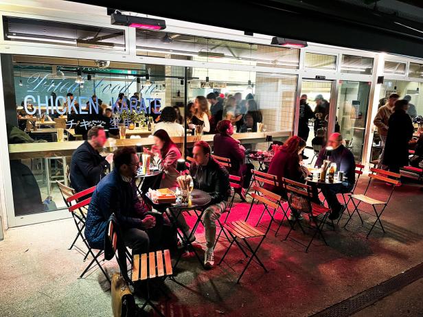 In der nagelneuen „Mochi“-Dependance „Chicken Karate“ überlässt er das Reden wie immer Tobias Müller. Vielleicht versteckt er sich aber auch ganz einfach vor der versammelten Wiener Gastro-Kritiker- und Food-Blogger-Szene, die sich schon am ersten Tag hier am Vorgartenmarkt eingefunden hat. Der Laden brummt, die Leute stehen teilweise von der offenen Selbstbedienungsküche bis vor die Tür hinaus an.