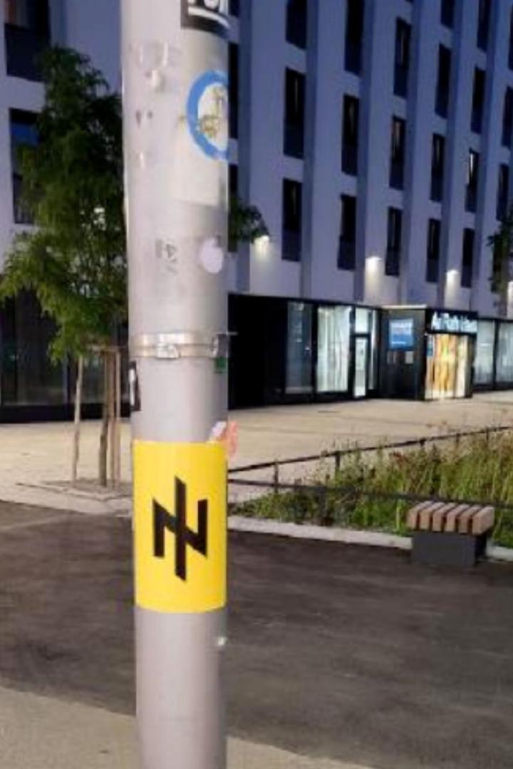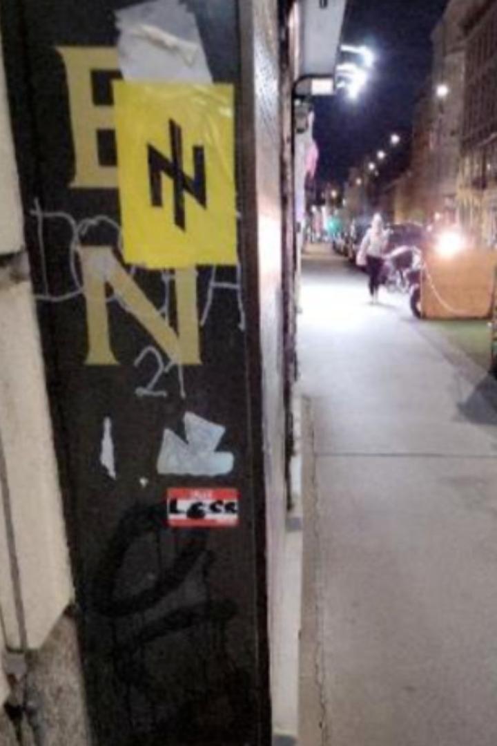 Auf der Wiener Kaiserstraße brachten Marsaleks Gehilfen 2022 gelbe Sticker mit der „Wolfsangel“ an. Das Symbol wurde damals vom Asow-Regiment genutzt. Es ist in Österreich und Deutschland verboten, weil auch SS-Einheiten das Symbol nutzten.