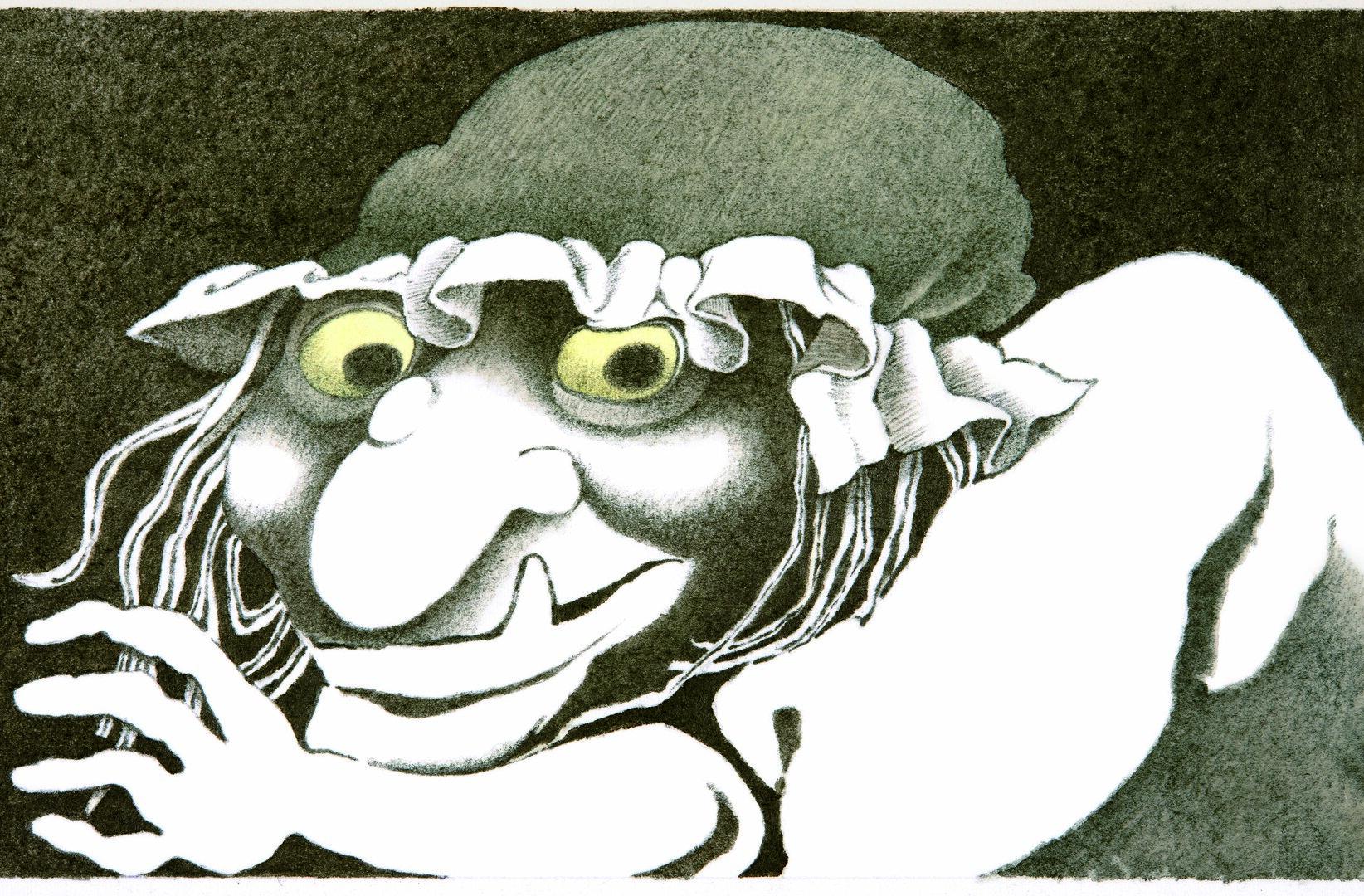 Kein Pfeifen hilft im stockfinsteren Wald, kein Flehen und Betteln, sobald die steinalte Frau, die sich bald als böse Hexe entpuppen wird, aus ihrem Knusperhäuschen schlurft, und das mit Riesenappetit: „Das wird ein guter Bissen für mich sein!“ Auf ihrem Speiseplan stehen die beiden Kinder. „Wenn eins in ihre Gewalt kam, da machte sie es tot, kochte es und aß es, und das war ihr ein Festtag.“