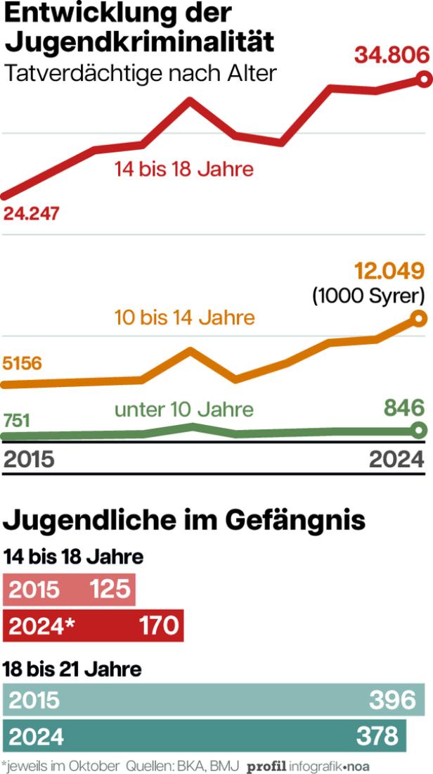 In Österreich liegt das Strafalter bei 14. Eine kurz diskutierte Absenkung auf zwölf Jahre wurde verworfen. Stattdessen tagt im Justizministerium eine Arbeitsgruppe, um Straftäter unter 14 in sonderpädagogischen Einrichtungen anhalten zu können, eine Art „Haft light“. Ob sich Regierung und Länder einigen, ist offen.