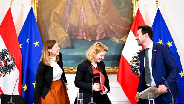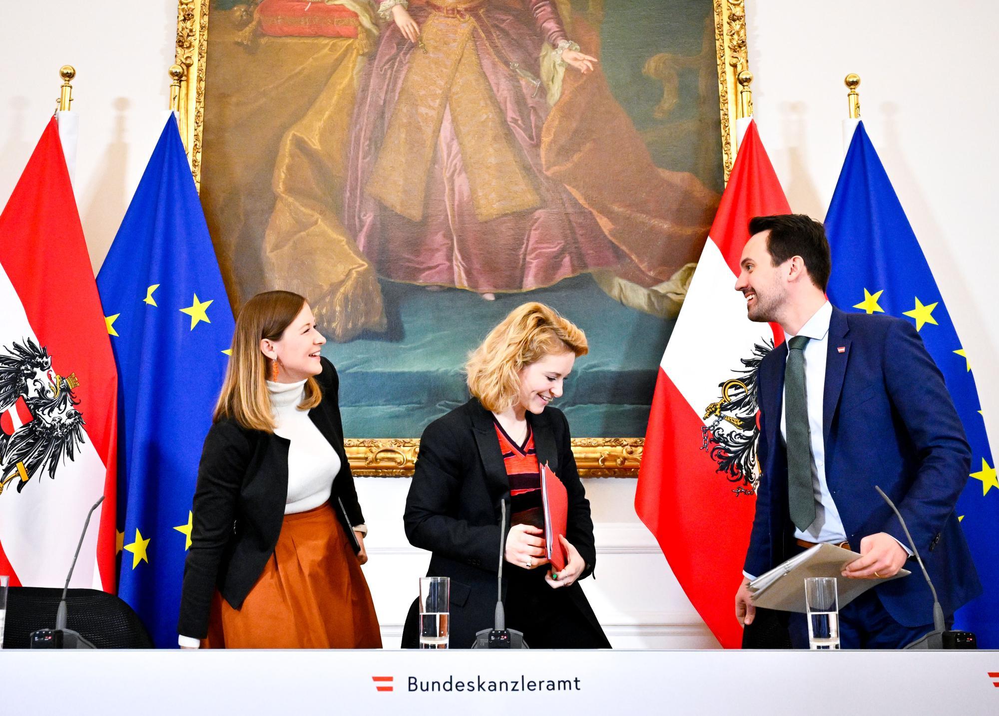Familienministerin Claudia Plakolm (ÖVP), Frauenministerin Eva-Maria Holzleitner (SPÖ) und Bildungsminister Wiederkehr (Neos) bei der Präsentation des Nationalen Aktionsplans gegen Gewalt an Frauen.