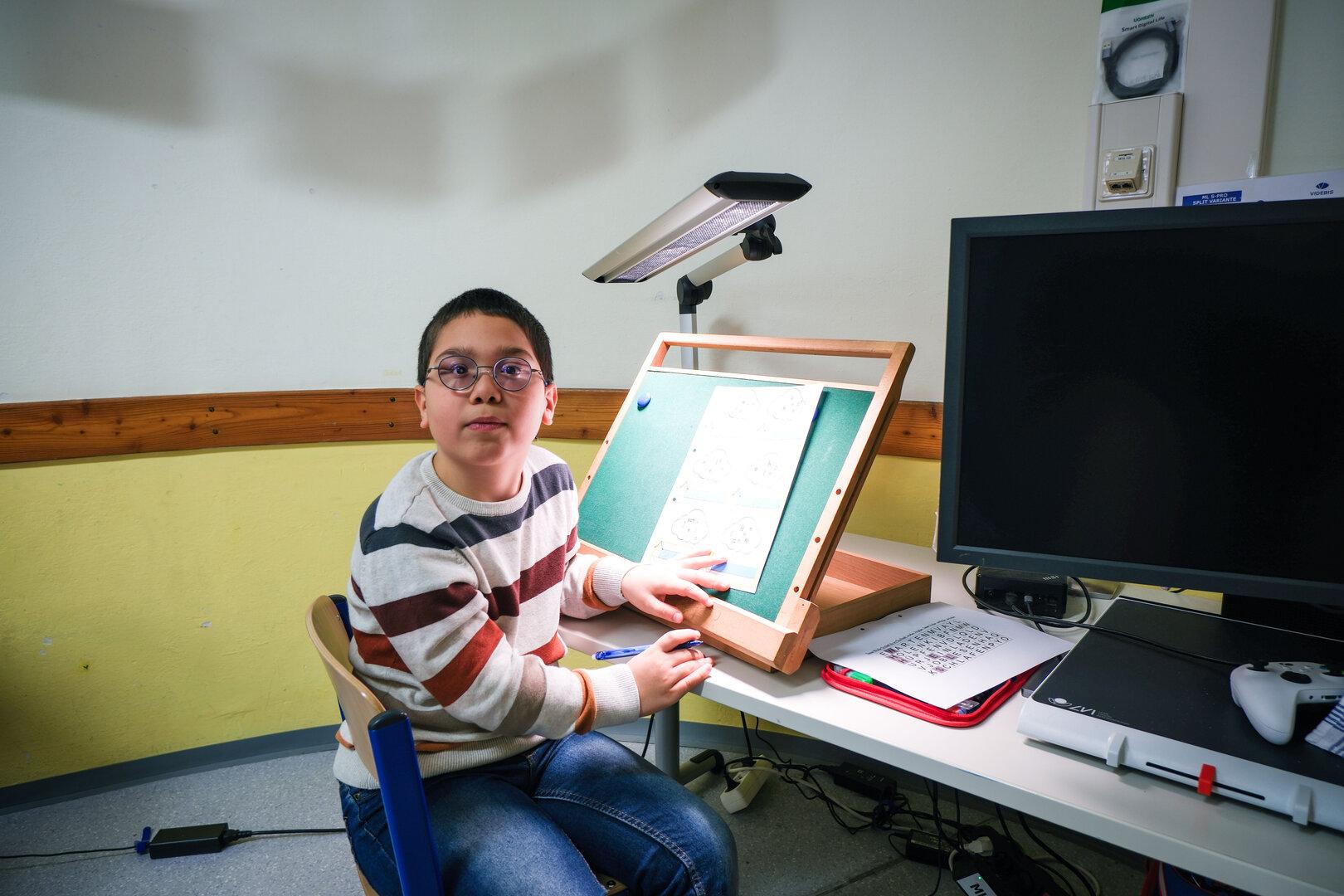 In einer kleinen Volksschulklasse stehen „Lernwörter“ auf dem Programm. Vier Kinder arbeiten ruhig und konzentriert, unterstützt von zwei Lehrerinnen. Der Raum ist verwinkelt und gemütlich eingerichtet, fast wie ein Wohnzimmer. Zwei Kinder schreiben unter einer eigenen Tischlampe, die das Arbeitsblatt beleuchtet. Ein Bub tippt seine Wörter in Blindenschrift in die Braille-Schreibmaschine. Ganitzer erklärt, dass hier alles auf die Bedürfnisse der Kinder abgestimmt ist – von den Räumen bis zu den Materialien. Vor dem Hintergrund spricht der Direktor lieber von einer Spezialschule: einer Schule für Kinder mit individuellen Bedürfnissen und Talenten.