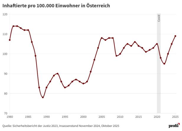 Sperrt Österreich zu viele Menschen weg? Es wäre nicht das erste Mal: Im Verhältnis zur Wohnbevölkerung waren Anfang der 1980er-Jahre sogar mehr Menschen in Haft als heute. 114 Inhaftierte kamen 1981 und 1981 auf 100.000 Einwohner:innen. Damit lag Österreich im Vergleich zu anderen westeuropäischen Ländern an erster Stelle, hält das Justizministerium in seinem Sicherheitsbericht für das Jahr 2023 fest.