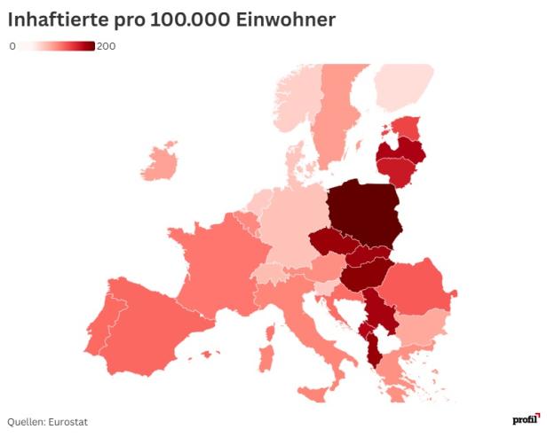 In den 1990er-Jahren reduzierte Österreich daher seine Gefangenenrate. Seit der Jahrtausendwende liegt sie aber wieder konstant um die 100 Inhaftierte pro 100.000 Einwohner:innen. Mittlerweile ist das zwar im europäischen Schnitt, aber immer noch deutlich höher als etwa in Deutschland, Slowenien und der Schweiz.