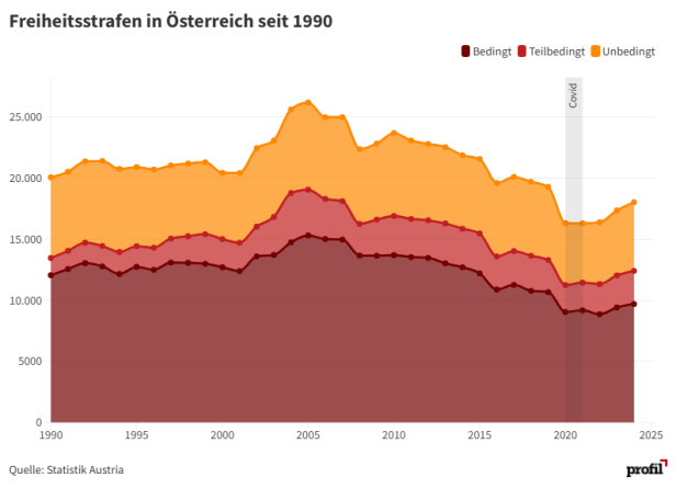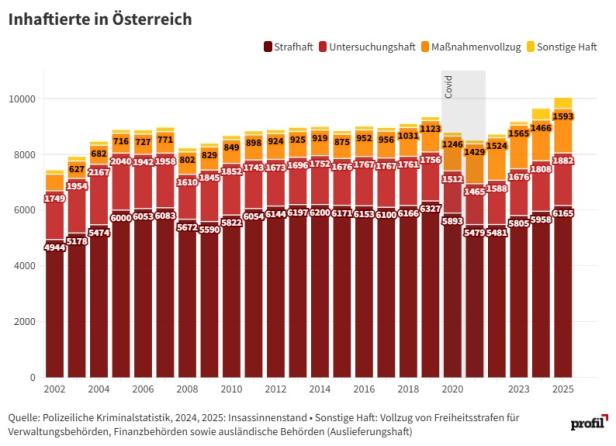 In absoluten Zahlen waren in Österreich noch nie mehr Menschen inhaftiert als 2025. Blickt man auf die Verurteilungsstatistik, ist dieser historische Höchststand kaum zu erklären: In Österreich wurden 2024 trotz wachsender Bevölkerung deutlich weniger Freiheitsstrafen ausgesprochen als noch vor der Pandemie.