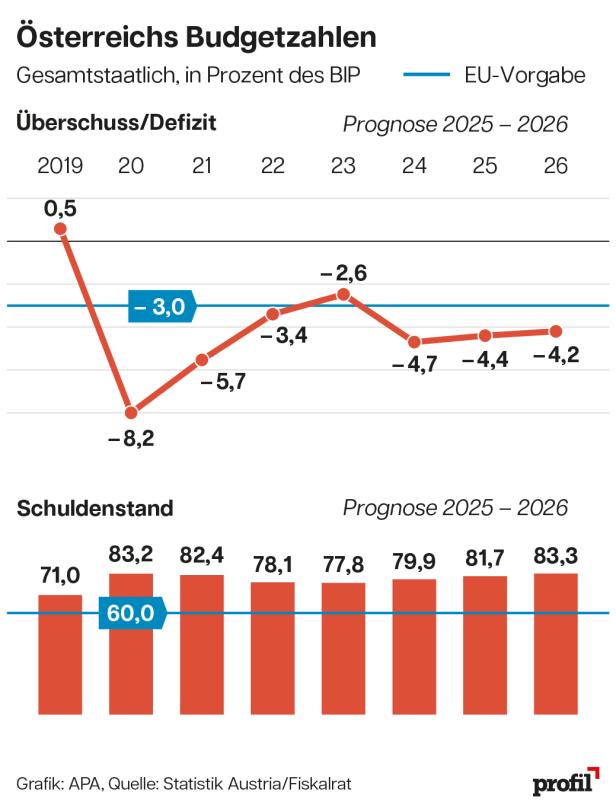 Positiv bewertet der Fiskalrat die moderaten Gehaltsabschlüsse im öffentlichen Dienst und erste Konsolidierungsschritte. Ihre Wirkung werde sich aber erst 2026 entfalten, meint Badelt. Dass das Defizit trotz dieser Maßnahmen bei über vier Prozent bleibt, liege an den hohen Staatsausgaben und der schwachen Wirtschaftsentwicklung.