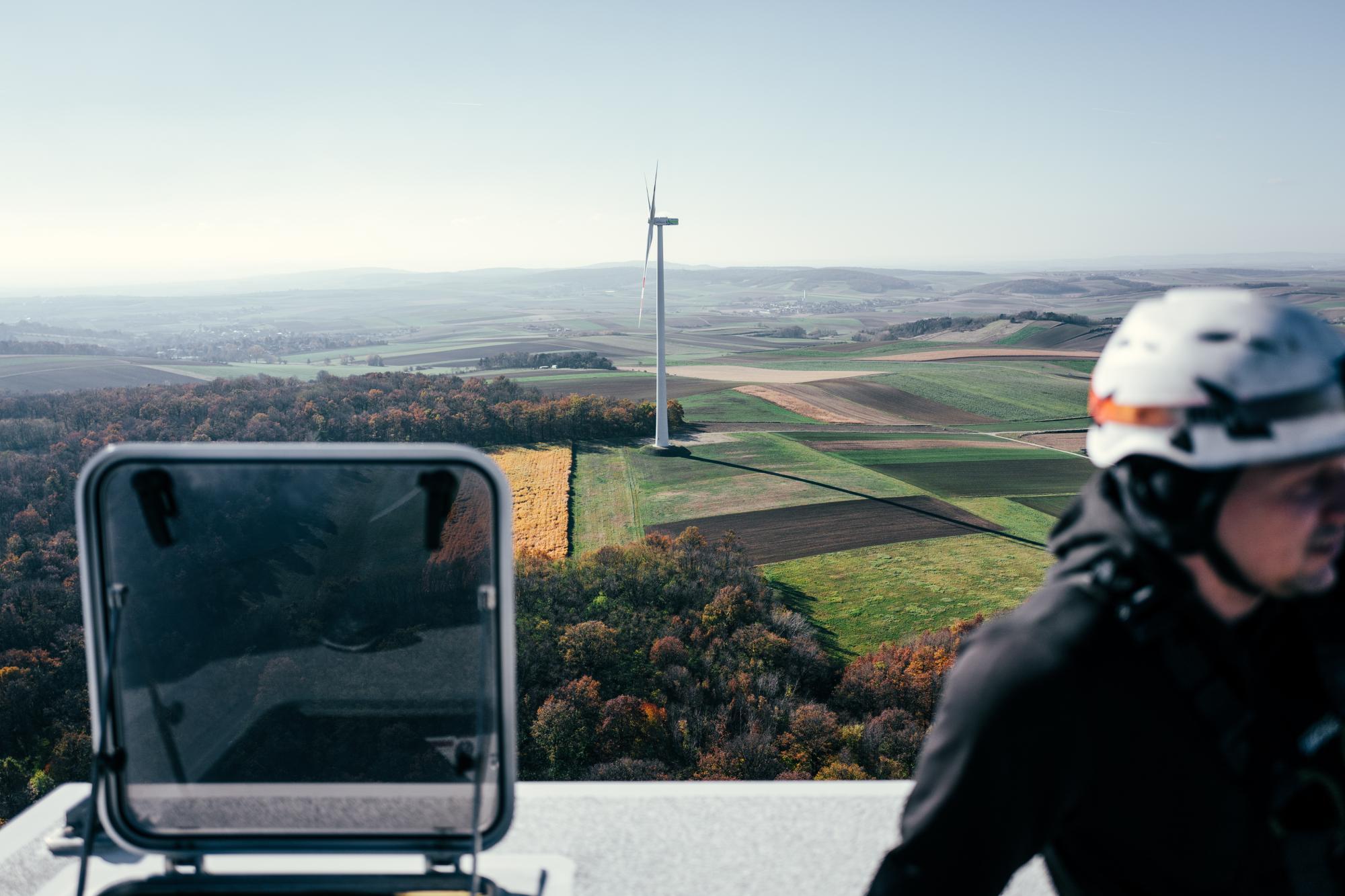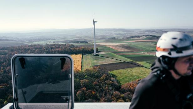 Markus Winter schlüpft in seinen Klettergurt und setzt einen Helm auf. Das ist Pflicht. Im Windrad herrschen ähnlich strenge Regeln wie auf einer Baustelle. Wer eine Leiter hochklettert, hängt sich mit dem Gurt ein. In den vergangenen Jahren haben sich hier, unweit des Firmensitzes der Windkraft Simonsfeld AG in Ernstbrunn, schon viele ein Bild gemacht. Die ehemalige Klimaschutzministerin Leonore Gewessler oder der damalige Bundeskanzler Karl Nehammer (ÖVP) im Jahr 2022 von unten. Andere schauten sich den Windpark von oben an, wie der AMS-Vorstand Johannes Kopf im Sommer 2023. Immer wieder seien die Besucherinnen und Besucher beeindruckt davon, wie viel Strom ein Windrad erzeugt: Die 143 Meter hohe Anlage produziere in einer Stunde so viel Energie, wie ein österreichischer Haushalt im ganzen Jahr verbraucht. So richtig gefruchtet haben die Firmenbesuche heimischer Spitzenpolitikerinnen und -politiker in der Vergangenheit aber nicht.