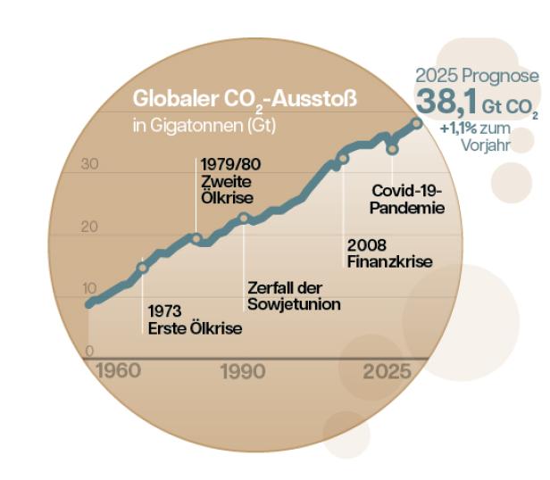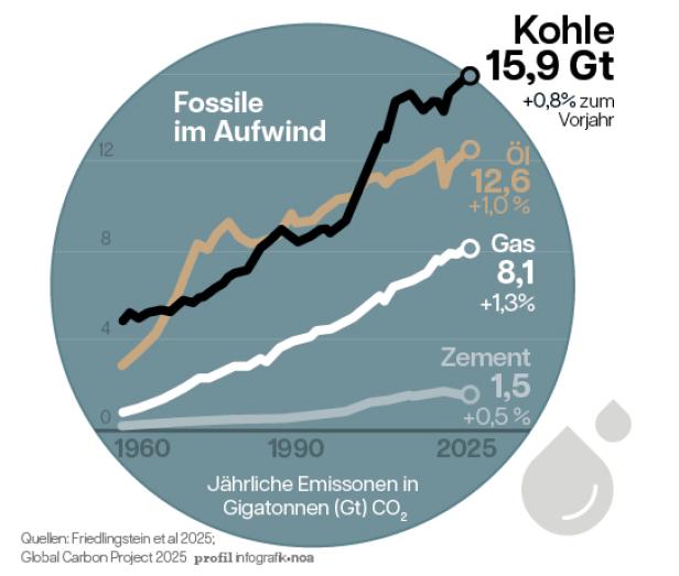 Der Kohlendioxidausstoß bricht auch heuer wieder alle Rekorde und übertrifft mit 38,1 Gigatonnen das Vorjahr noch einmal um 1,1 Prozent. Zu diesem Ergebnis kam die internationale Forschungsinitiative Global Carbon Project, zu dessen mehr als 100 Autorinnen und Autoren auch Julia Pongratz zählt. Der Verbrauch von Kohle, Öl und Gas ist trotz des weltweiten Ausbaus von Wind- und Sonnenenergie weiterhin enorm.