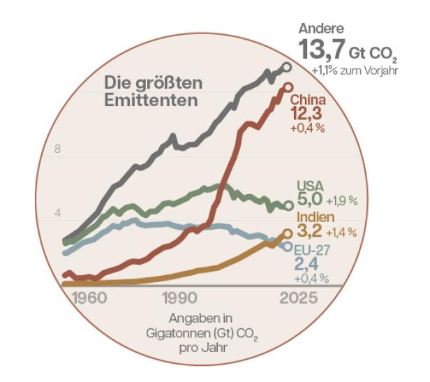 Mit 12,3 Gigatonnen führt China auch heuer die Liste der größten Emittenten an, gefolgt von den USA mit fünf Gigatonnen, Indien mit 3,2 und der EU mit 2,4. Alle verzeichnen ein leichtes Plus im Vergleich zum Vorjahr. Die gute Nachricht: „China hat heuer wahrscheinlich ein Plateau erreicht, eine Trendwende ist in Sicht“, sagt der österreichische Klimaforscher Gerhard Wotawa. Aktuell pumpt das Land zehn Mal mehr Geld in Erneuerbare als in fossile Energieträger.