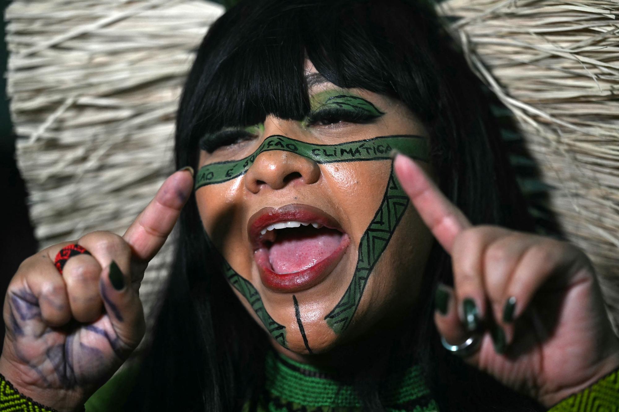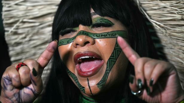 Die indigene Politikerin mit der Botschaft „Landrechte für Indigene sind eine Klimalösung“ im Gesicht bei der Klimakonferenz in Belém, Brasilien.