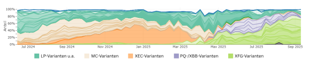 Laut Abwasserdaten kursiert nach der Variante LP.8.1, auf welche die Impfstoffe ausgelegt sind, nun die Variante XFG. Die beiden sind sich sehr ähnlich, deshalb wirkt das Vakzin sehr gut.