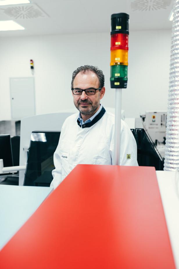 „Hier werden die Komponenten zu funktionalen Einheiten zusammengefügt, zu fertig bestückten Platinen“, sagt Kurt Kober, Geschäftsführer von Beyond Gravity, einem Unternehmen mit rund 250 Mitarbeitern. Diese Platinen sind die Bausteine eines Satelliten-Navigationssystems, das hier am Wiener Standort von Beyond Gravity gefertigt wird.