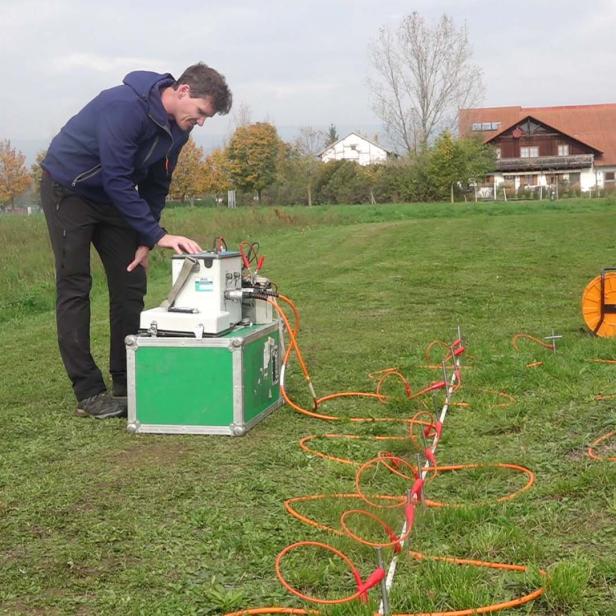 Adrian Flores-Orozco ist Leiter des Forschungsbereichs Geophysik an der TU. Normalerweise sucht er nicht nach Knochen, sondern nach Kies, Ton, Sand oder Wasserreservoirs im Boden. Bei einer elektrischen Messung steckt er Metallspitzen in den Untergrund, verbindet sie über Kabeln mit einer Batterie und erzeugt ein elektrisches Feld. Sensoren an der Oberfläche messen die elektrische Impedanz im Untergrund. Die verschiedenen Sedimente erzeugen unterschiedliche Muster – so kann der Forscher am Ende ein dreidimensionales Bild des Bodens erstellen.